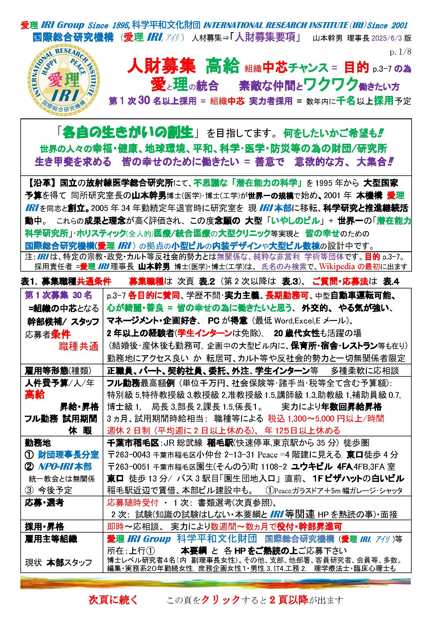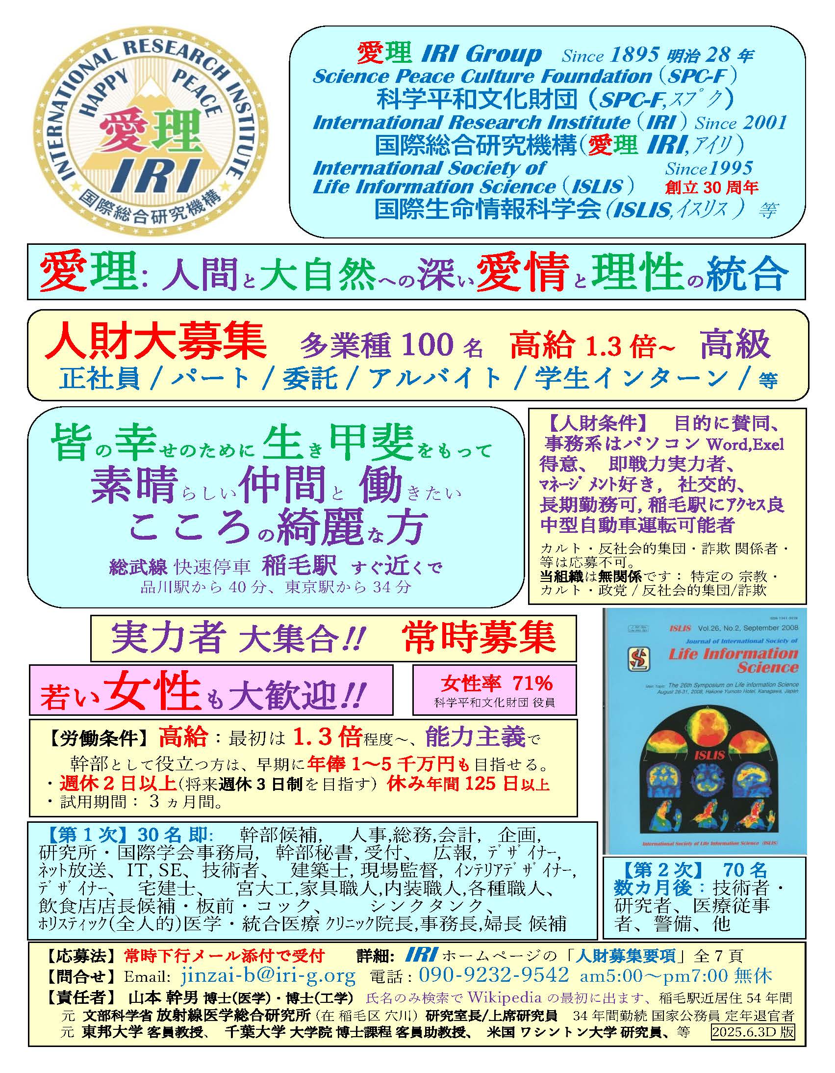 International Research Institute (IRI ) 運営: 内閣総理大臣認証 NPO法人 特定非営利活動法人 国際総合研究機構 (IRI =アイリ) iri@a-iri.org http://www.a-iri.org/iri-jp/ 043-255-5481 Fax-5482 〒263-0051 千葉市稲毛区園生町1108-2 4FA |