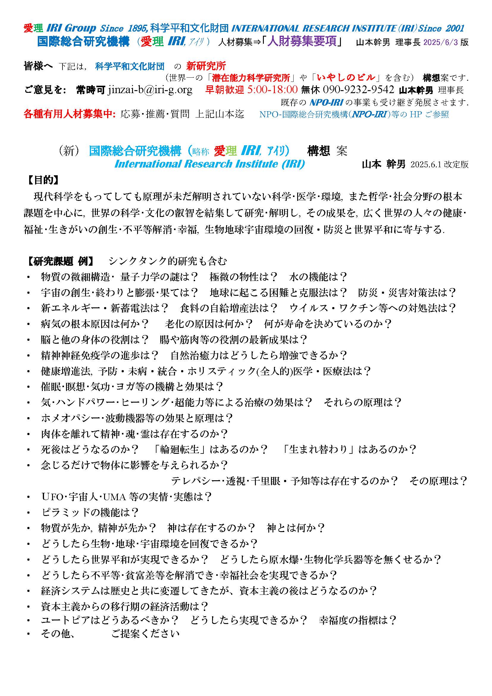 | ■6/20(土) 特定非営利活動法人 国際総合研究機構 (NPO-IRI) 2026年通常総会/新理事会 開催 IRI 「いやしのビル」企画委員会 討論会・2026年通常総会 開催 |