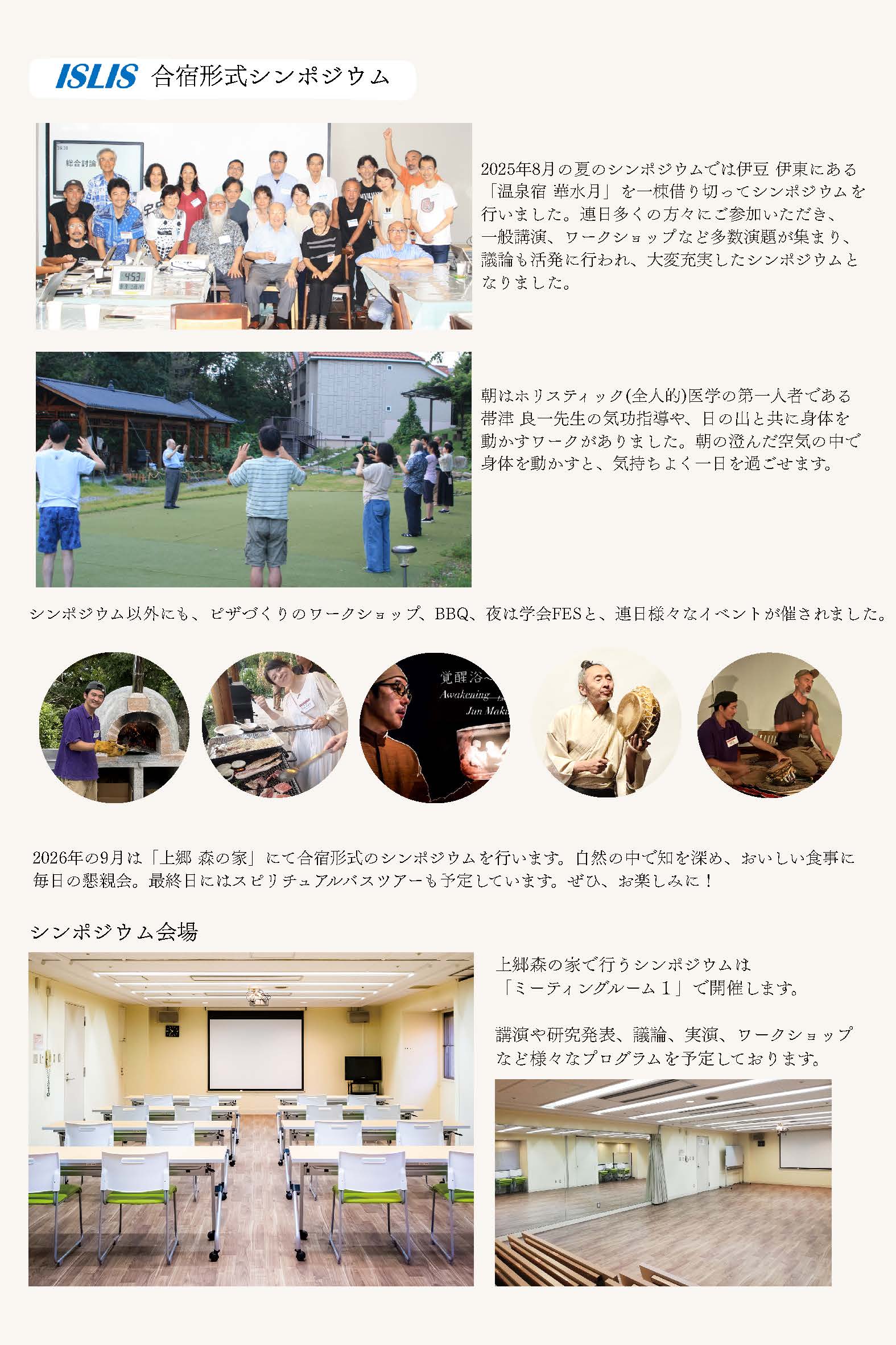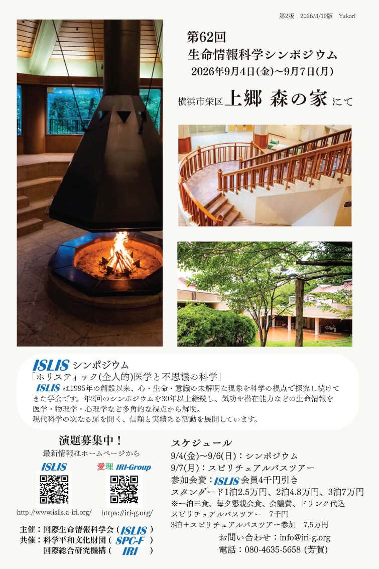 | ■ISLIS 国際生命情報科学会(ISLIS) 合宿 第XⅥ回 主テーマ: 「富士山麓のリトリートで命の循環を体験・体感する」 ―フェーズフリーのホリスティック医学とは ― 開催地:富士宮市猪之頭(富士山麓・朝霧高原) / 日月(ひげつ)倶楽部・富士山靜養園 開催日: 2024年 8月 2-5日(金-月) 第58回生命情報科学シンポジウム 学術部門: 第58回国際生命情報科学会(ISLIS ) 学術大会 一般部門: 第58回生命情報の科学フォーラム |