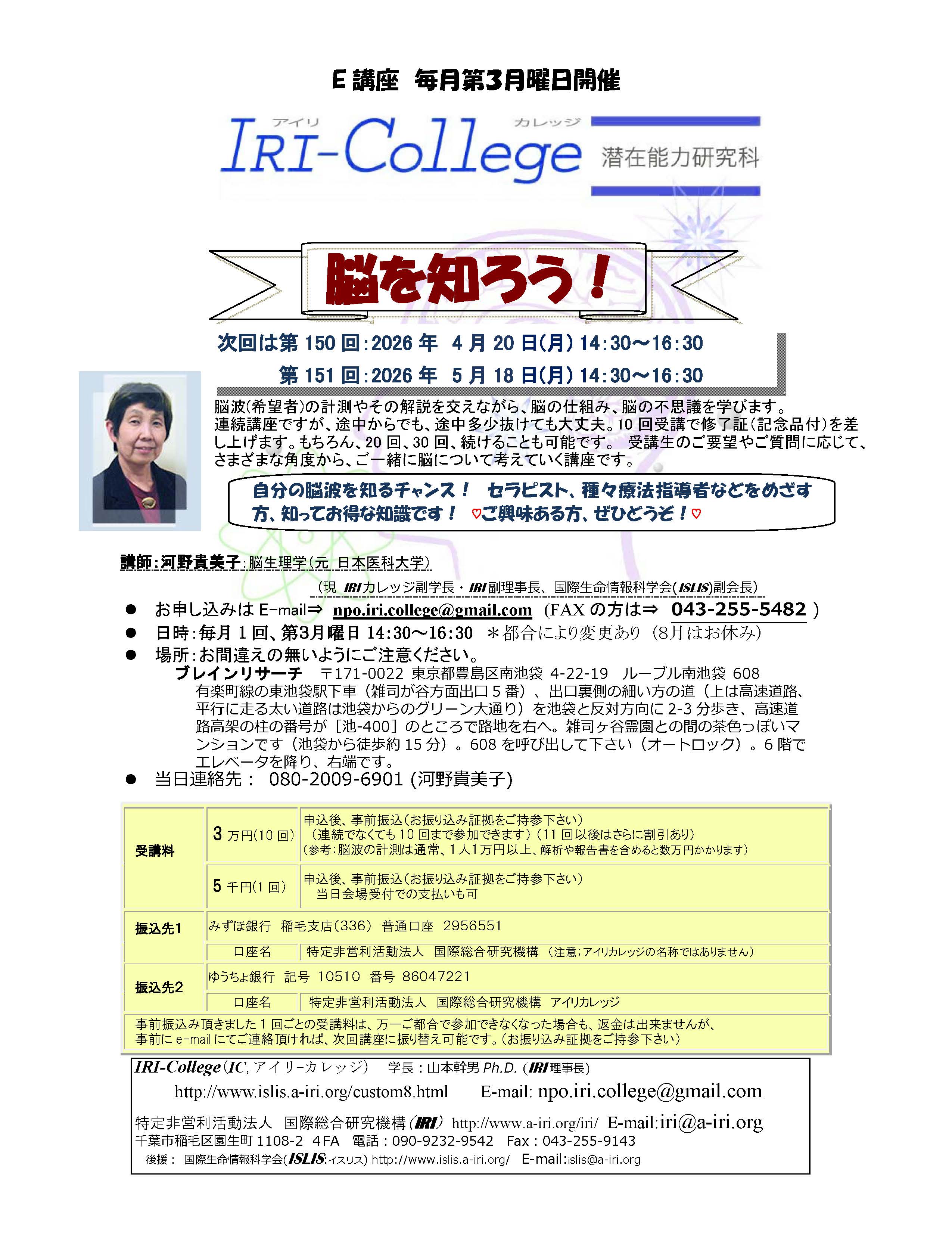 | アイリ カレッジ(IC) | 受講生のご要望やご質問に応じて、さまざまな角度から、ご一緒に脳について考えていく講座です。 |